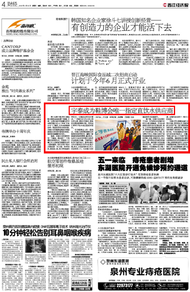 據(jù)了解,宇泰公司總部位于北京,作為國內(nèi)水處理行業(yè)的先入者,專業(yè)從事家庭生活飲用水處理設(shè)備,商業(yè)、工業(yè)水處理系統(tǒng)的研發(fā)、生產(chǎn)、銷售及運(yùn)營維護(hù)服務(wù)。該公司于2010年進(jìn)入晉江市場(chǎng),僅僅第3個(gè)年頭,宇泰公司的產(chǎn)品和品牌便得到本地企事業(yè)單位的青睞,目前,鴻星爾克、潯興股份、新亞等企業(yè)均使用宇泰凈水設(shè)備。據(jù)宇泰公司總經(jīng)理周有明介紹,用凈水設(shè)備取代桶裝水,不僅能保證員工喝上健康安全的直飲水,從長(zhǎng)遠(yuǎn)考慮,還能為企業(yè)省下一筆不小的成本。